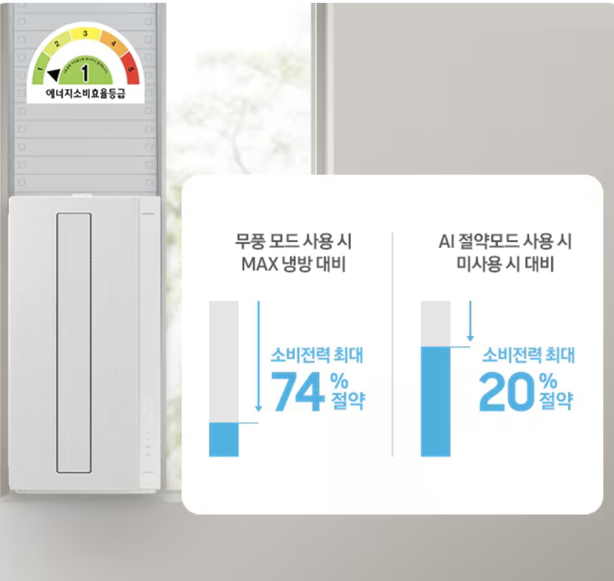 삼성의 핵심 기술 중 하나인 '무풍 냉방'이 이 작은 창문형 에어컨에 그대로 들어갔습니다.